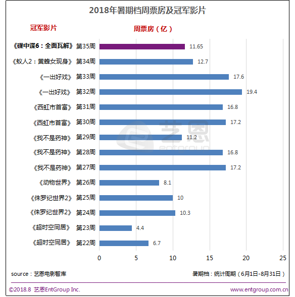 据艺恩电影智库统计,第35周(8月27日-9月2日)票房收入11.65亿元,同比上升29.6%,环比下降8.3%,位居2018年暑期档内周票房第八名。作为暑期档内后一周,该周仍有10部影片希望抓住暑期档的尾巴,竞争档期内后一波红利,大多沦为炮灰。