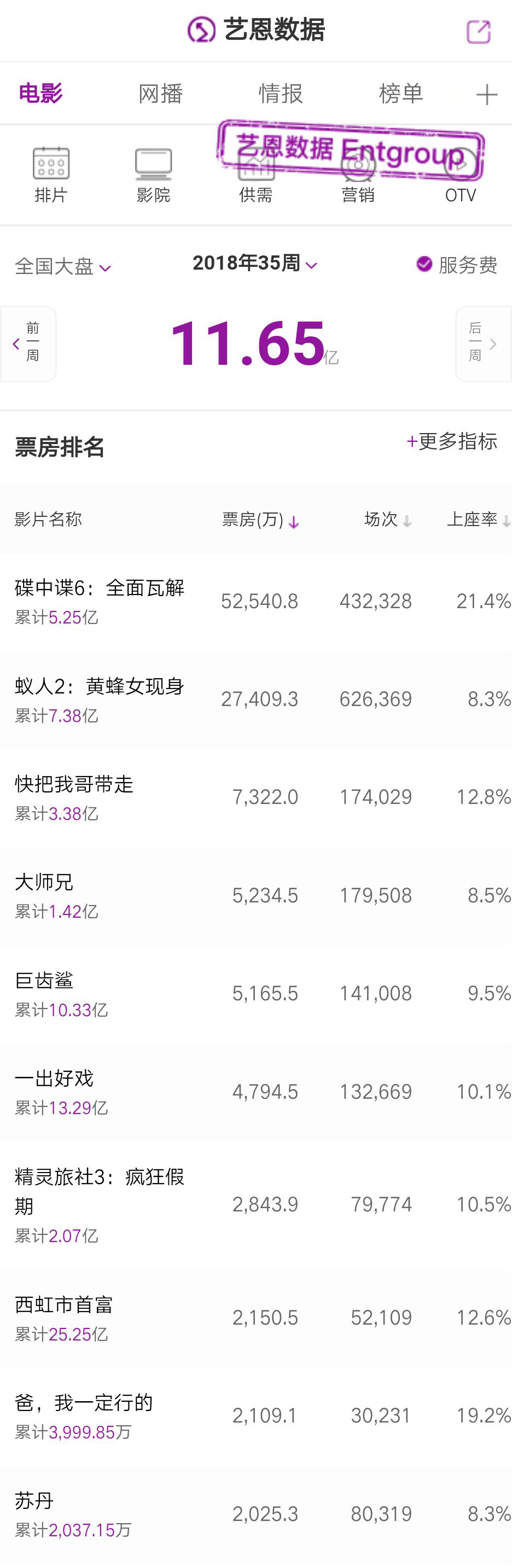 据艺恩电影智库显示,第35周全国影院票房产出11.65亿元,环比下降7.9%,同比上升29.6%,观影人次达3280.64万,平均上座率为12.21%。作为暑期档的后一周,尽管有好莱坞大片《碟中谍6》的加持,该周影院票房仍有持续下滑。