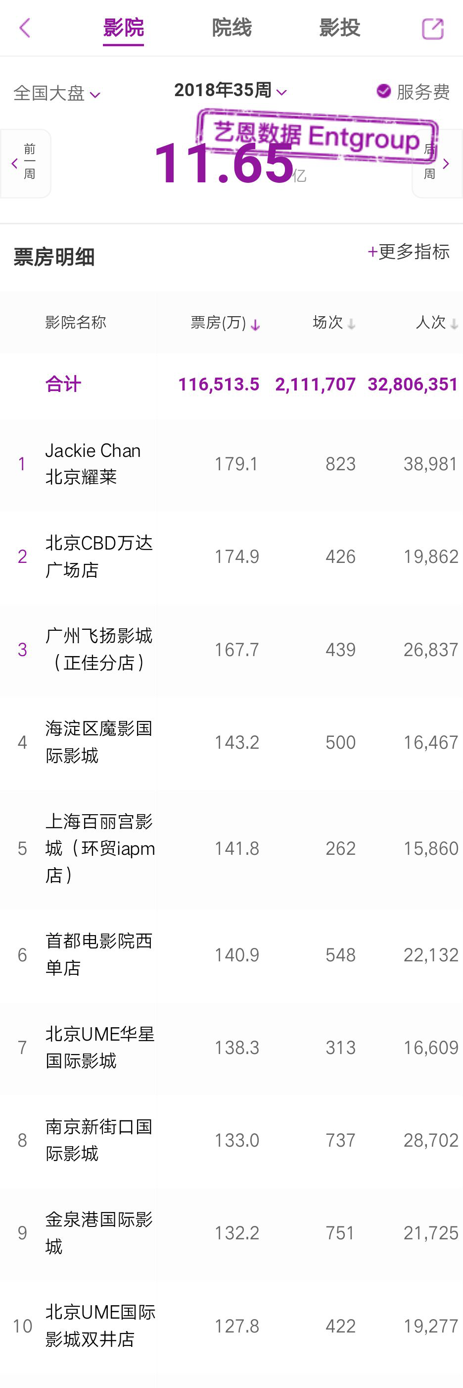 该周票房收入破亿级院线又减少1家,除万达院线外还有大地院线和上海联和院线,并分列二、三位。